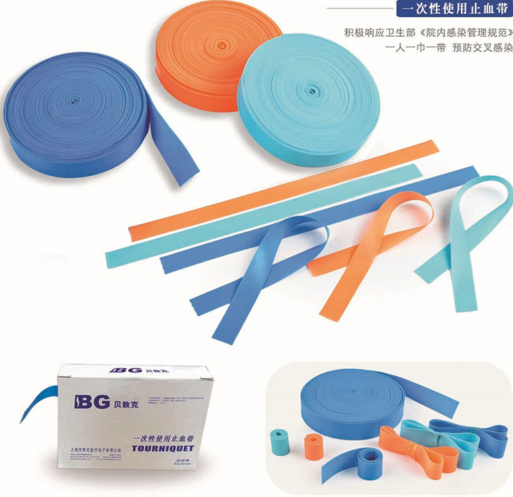 上海貝敦克醫(yī)療電子有限公司生產(chǎn)的"BG貝敦克"牌一次性使用止血帶,根據(jù)臨床需求不同,分為BGT-1型、BGT-2型、BGT-3型、BGT-4型等不同型號(hào),供醫(yī)護(hù)人員臨床方便使用。用于醫(yī)院病人靜脈輸液和血站、醫(yī)院采血及急救止血時(shí)使用。